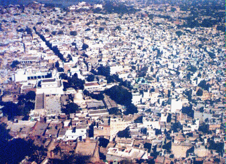 | The view from the hills above the shrine of Khawaja Muinuddin Hasan Chishti. The dome of the shrine can be made out with the surrounding complex of buildings including the mosque. Just in front of the shrine Sharib House, the home of Dr Zahurul Hasan Sharib and the Gudri Shahi Order, can also be seen. (photo courtesy of Rubina Rubini) |