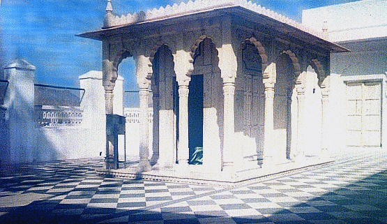 | Adjacent to the Chilla of Hazrat Khawaja Muinuddin Hasan Chishti (see page two) is the splendid marble tomb of Hazrat Saeenji Gudri Shah Baba, founder of the Gudri Shah Order of Sufis. This marble shrine commands a spectacular view over the Anna Sagar lake. |