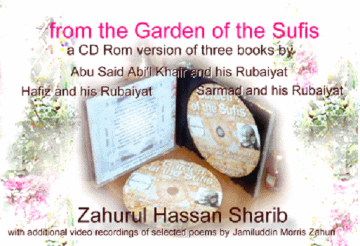 | A new publishing venture from Sharib Press 'From the Garden of the Sufis' Abu Said Abi'l Khair and his Rubaiyat, Hafiz and his Rubaiyat, and Sarmad and his Rubaiyat. The life and times of these three sufi poets with original translations from the Persian by Dr Sharib. The rubaiyat are verses of four lines conveying a single sustained thought. This gives them a power to convey a deep and lasting impression on the mind. This multi media CD Rom brings together three of the most formidable exponents of this poetic form. The intention is to enable computer users to access the full texts of three of the books of Dr Zahurul Hassan Sharib. There is additional material including pictorial illustrations, photographs, and video recordings of selected poems read by Jamiluddin Morris Zahuri. The CD Rom comes in its own jewel case and with specially designed cover and label. It can be opened in 'Windows Explorer' or other suitable programmes. Price, by order from this web site only: £ 5.00 plus p&p. e-mail us at jamil.morris@btinternet.com |