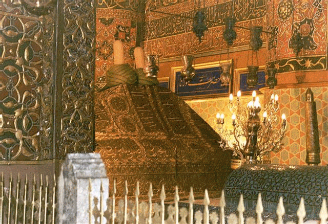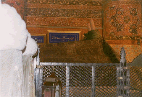 The tomb of Mevlana Jalaluddin Rumi. In the foreground, behind a cordon, is the silver step that pilgrims are permitted to kiss on the