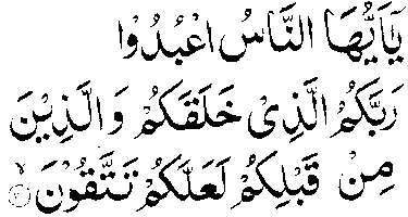 Yaaa-'ayyu-han-naasu'-buduu Rabba-kumullazii khalaqa -kum wallaziina min-qablikum la- 'allakum tattaquun.
