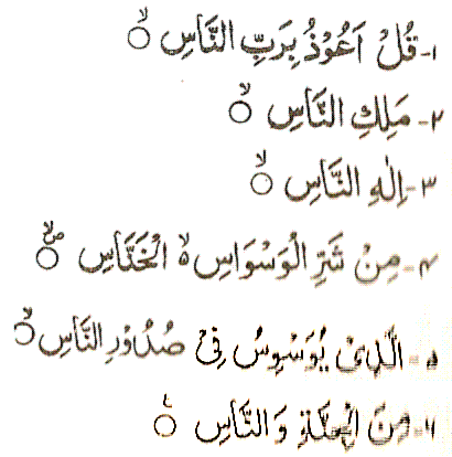 Say: 'I take refuge with the Lord of men, the King of men, the God of men, from the evil of the slinking whisperer who whispers in the breasts of men of jinn and men.