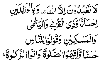 Laa ta'-bu-duuna 'illallah wa bil-waali-dayni 'ihsaananw-wa zil-qurbaa wal-yataamaa wal-masaa-kiini wa quuluu linnaasi husnanw-wa aqiimus-Salaata wa 'aatuz-Zakaah.