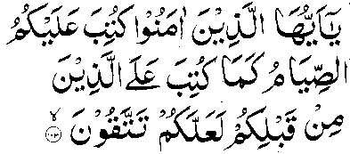 Yaaa-'ayyu-hallaziina 'aamanuu kutiba 'alay-kumus-Siyaamu kamaa kutiba 'alal-laziina min-qablikum la-'allakum tatta-quun,-