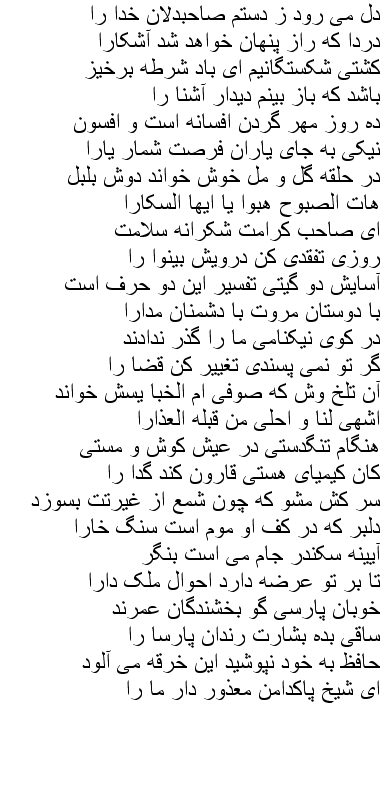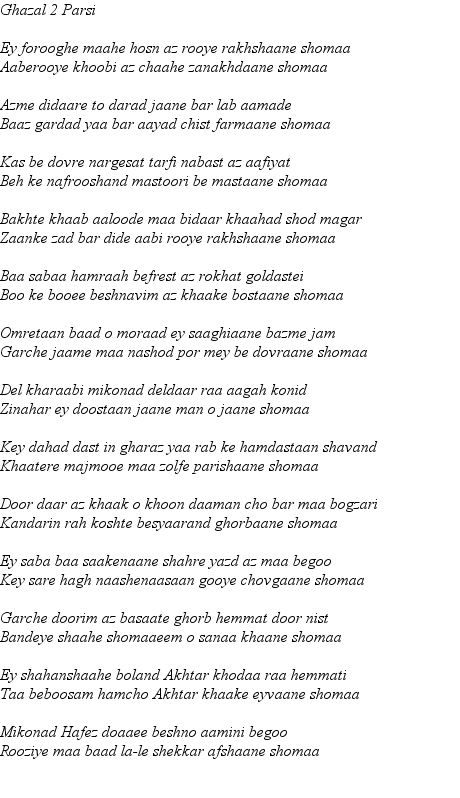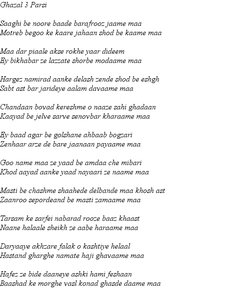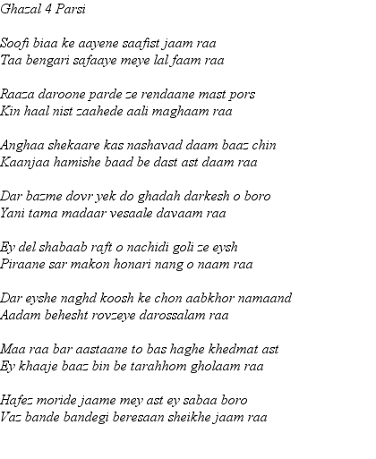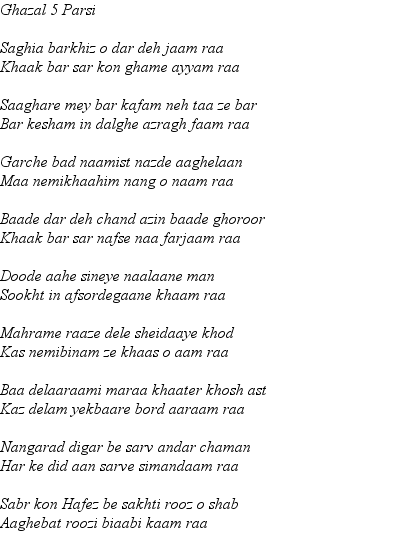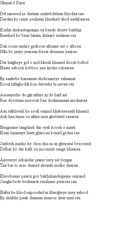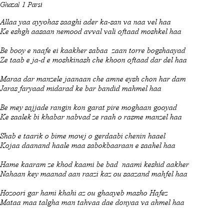 From this page onward they are all Ghazals. These are longer poems which have musically oriented form in which each full line ends with the same word. This for the most part we have not attempted to reproduce - preferring to use the archaic form of rhyming couplets more familiar in the Masnevi of Mevlana Rumi and others. In preparing these re-translations we are especially indebted to Maryam Moghadam of Shiraz may Hafiz Saheb reward her for the same.
