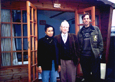 | Jamiluddin Morris Zahuri (centre) with Jeff and Kelly, outside Zahuri Manzil, Southampton (UK). Dr Kelly Pemberton has recently completed her doctoral thesis on the role of women at sufi shrines in India. Jeff is an artist and teacher of distinction. Zahuri Manzil has been built to be used for fatiha for Khawaja Gharib Nawaz and saints of the Gudri Shah Order by followers of Dr Zahurul Hassan Sharib. It is also used for Zikr, reading of Holy Qur'an, and for meditation and listening to tapes and discs of Qawalli. |
